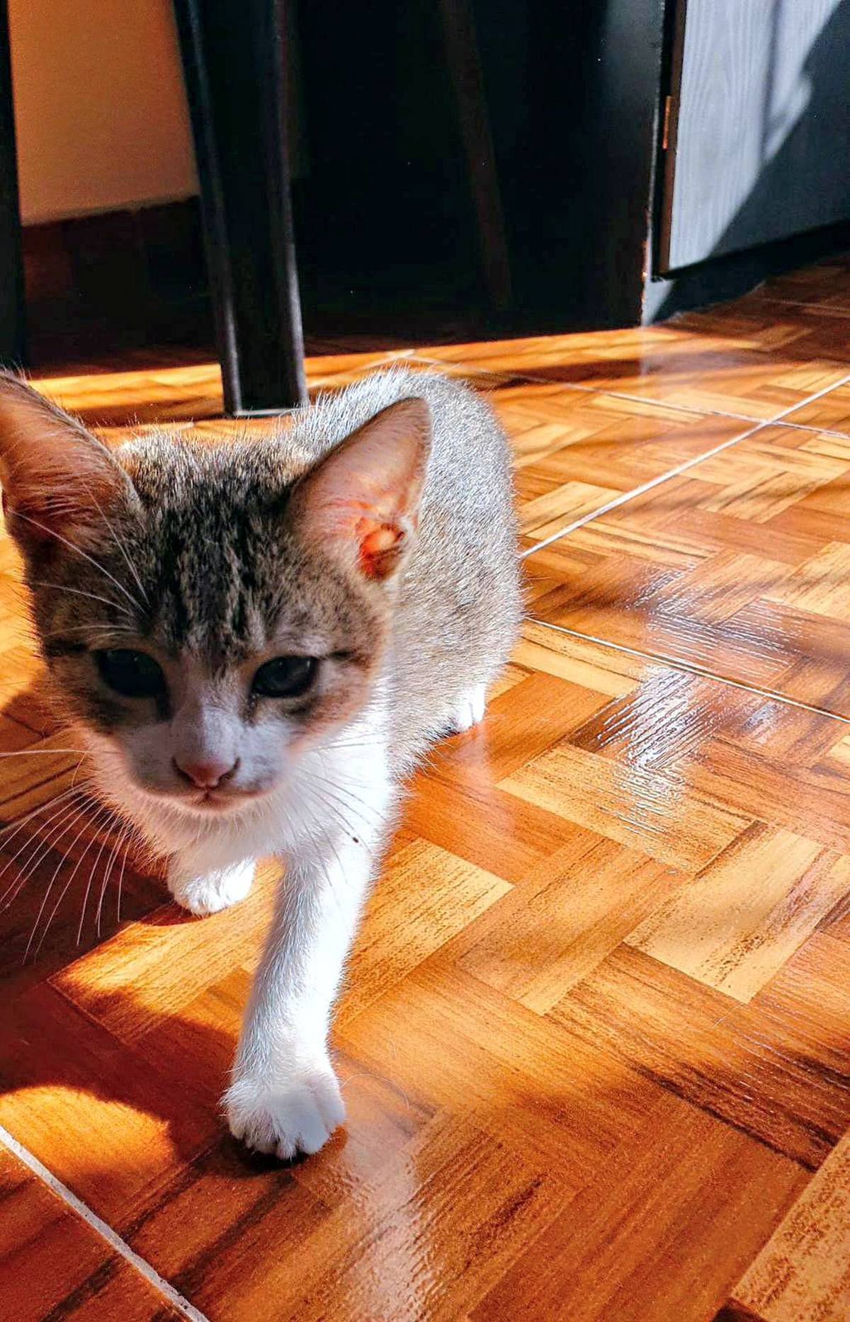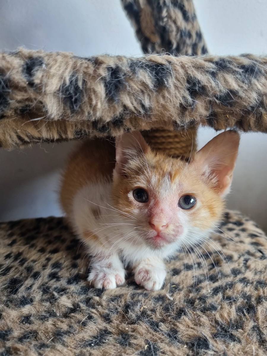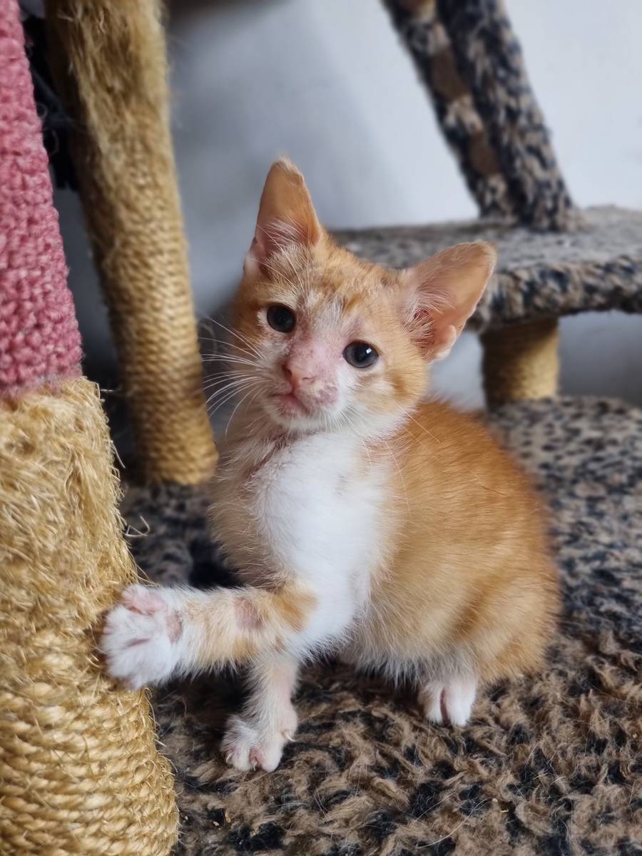 Luego de cuidarlo por un tiempo su pata ya sano y esta subiendo de peso. Lamentablemente salio positivo en VIF por lo tanto el solo puede convivir con otros gatos también positivos o con otros animales (perros, aves, etc). El VIF no afecta su calidad de vida ni a humanos.